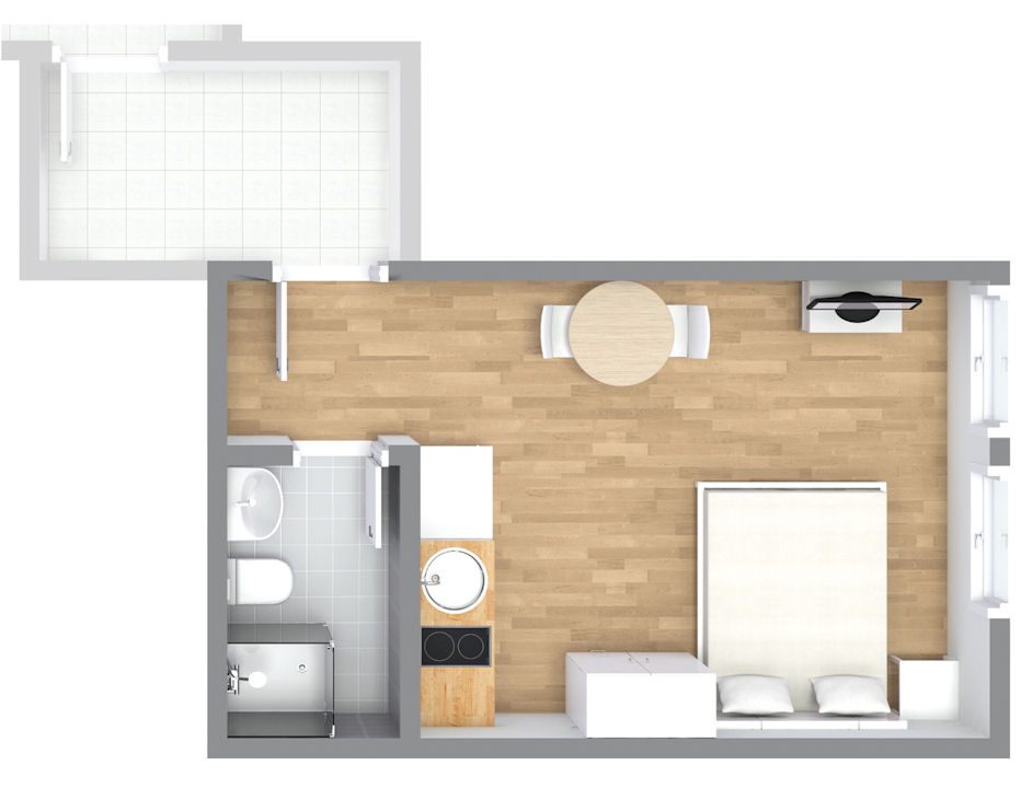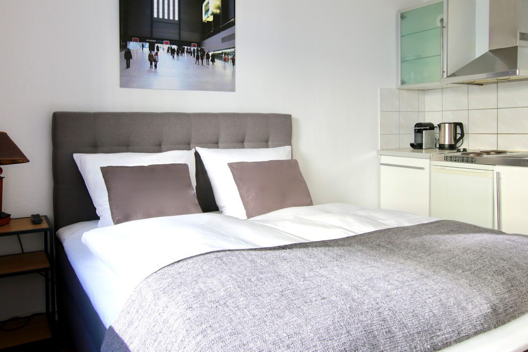 Moderne Möblierung, Fliesenboden, integrierte Singleküche mit Herd, Badezimmer mit Dusche, Flatscreen, Kabel-TV, WLAN- Internetanschluss