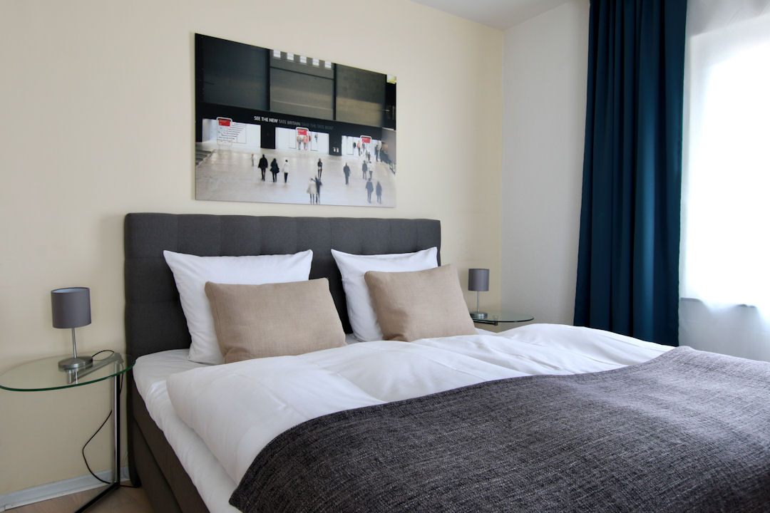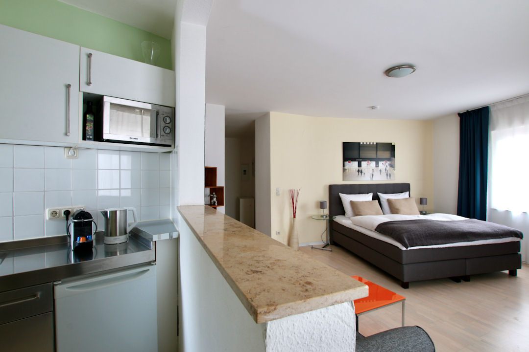 Wohn/Schlafzimmer mit franz. Bett, Bettwäsche- und Reinigungsservice optional gegen Aufpreis möglich, DSL WLAN-Internetanschluss inkl., Mindestmietdauer 2 Monate, , –Miete inkl. Nebenkosten: 2180,00 pro Monat(inkl. 7% MwSt.), inkl. Strom, inkl. Heizung, plus 180 Euro Endreinigung