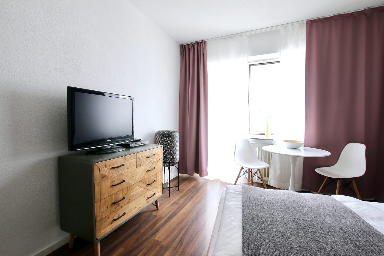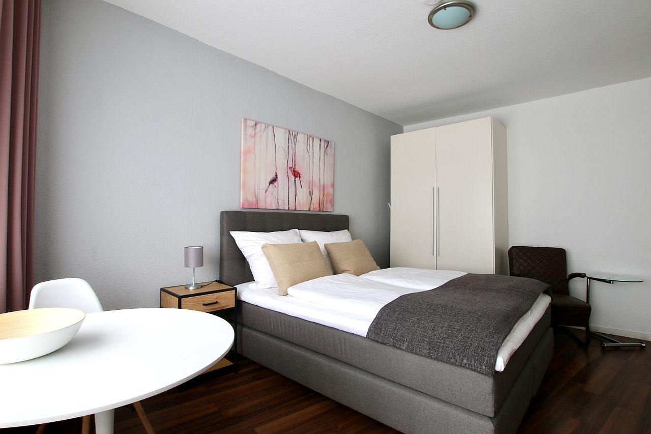 Balkon, Wohn-/Schlafzimmer mit Doppelbett 1,60 m, Bettwäsche- und Reinigungsservice auf Anfrage (gegen Aufpreis) möglich, Waschkeller vorhanden, Tierhaltung nicht gestattet, DSL WLAN-Internetanschluss 8,00 Euro/Woche optional, Mindestmietdauer 2 Monate,