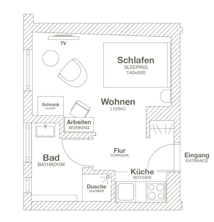 Wohn-/ Schlafraum mit franz. Bett 1,40m,W-Lan Internetanschluss gegen Gebühr, Bettwäsche und Handtücher nicht vorhanden, Reinigungsservice nach Absprache gegen Aufpreis, Tierhaltung nicht gestattet, Nichtraucher, max. 2 Personen, 2. Person gegen Aufpreis, Mindestmietdauer 6 Monate