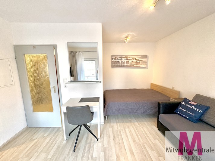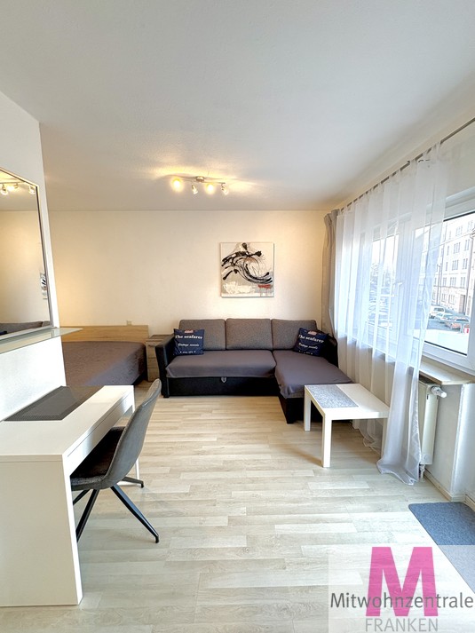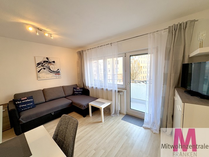Die charmante und lichtdurchflutete 1-Zimmer-Wohnung überzeugt mit einem modern gestalteten Wohn- und Schlafbereich, der durch große Fenster und den direkten Zugang zum Balkon besonders hell wirkt. Ein komfortables Doppelbett, ein stilvolles graues Schlafsofa, eine weiße Kommode mit TV sowie ein gemütlicher Schreibtisch schaffen eine funktionale und ansprechende Wohnatmosphäre.