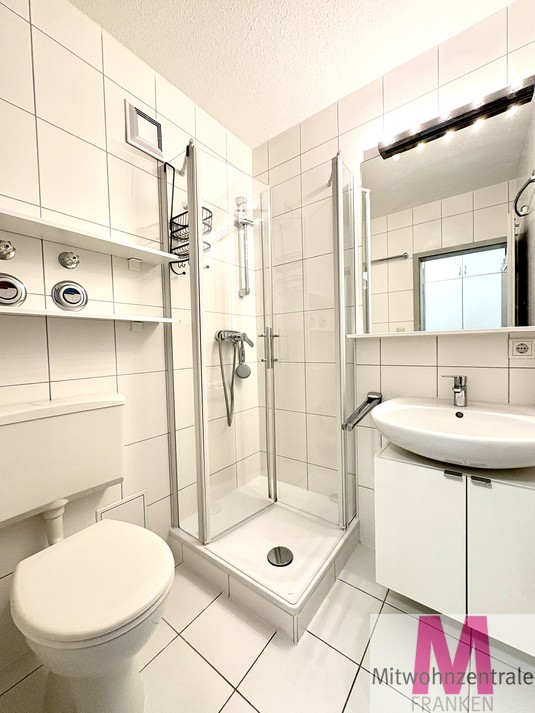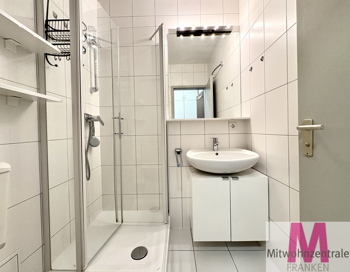 Das Badezimmer präsentiert sich modern und großzügig, mit bodentiefer Dusche, großen Fliesen und praktischem Stauraum für Alltagsutensilien.