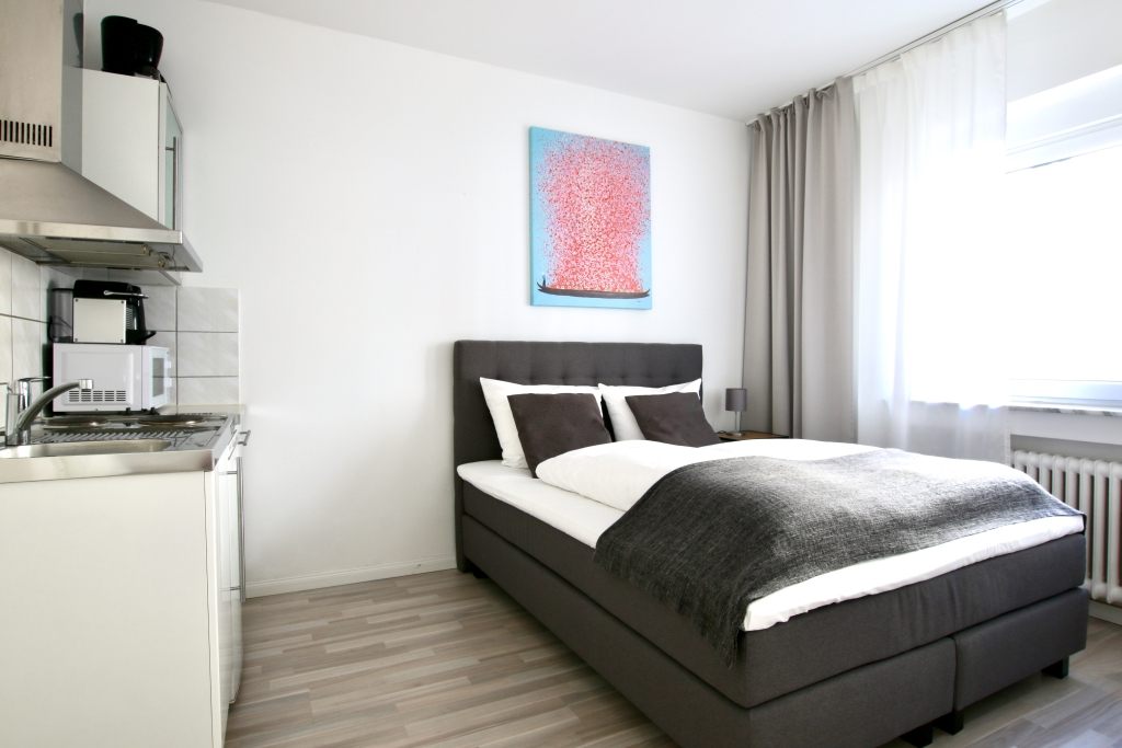 Bedroom with queen-size bed 1.40 m, bed linen and towels available, pets by arrangement, non-smoking, incl. WiFi Internet access, cleaning and laundry service against a surcharge optionally, minimum term of lease 6 months, plus final cleaning 140,00 €