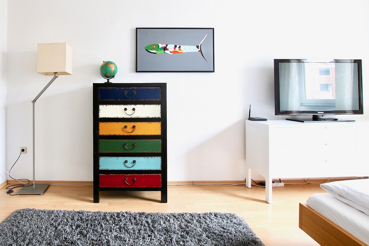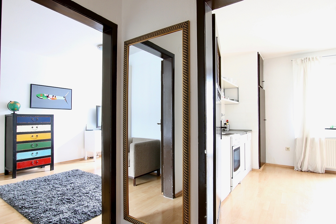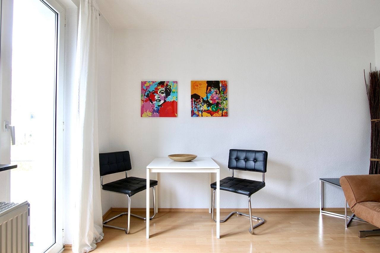 Balcony, living room, bedroom with queen-sized bed 1.40 m, bed linen and towels available, incl. WiFi internet connection, cleaning and washing service optionally, minimum term of lease 2 months, shorter rental period on request, plus final cleaning 180,00 €