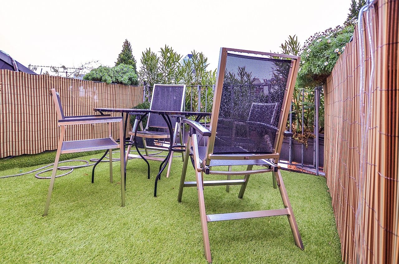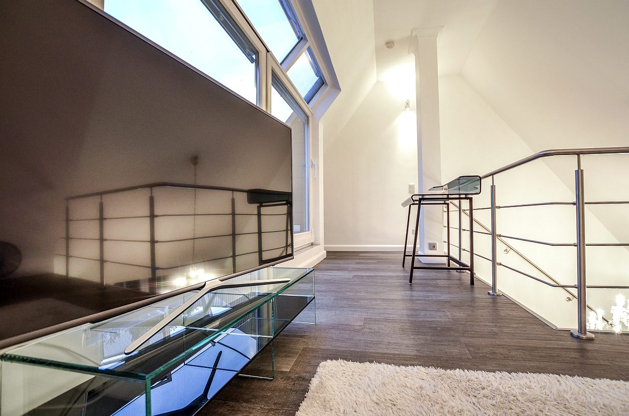 lower level with dining room, bathroom, bedroom and balcony, upper level with living room and roof terrace, living room with sofa bed 1,40m, bedroom with double bed 2,00m, bedlinen and towels available, pets not allowed, non-smoking, incl. Max. 2 persons, minimum rental period 6 months