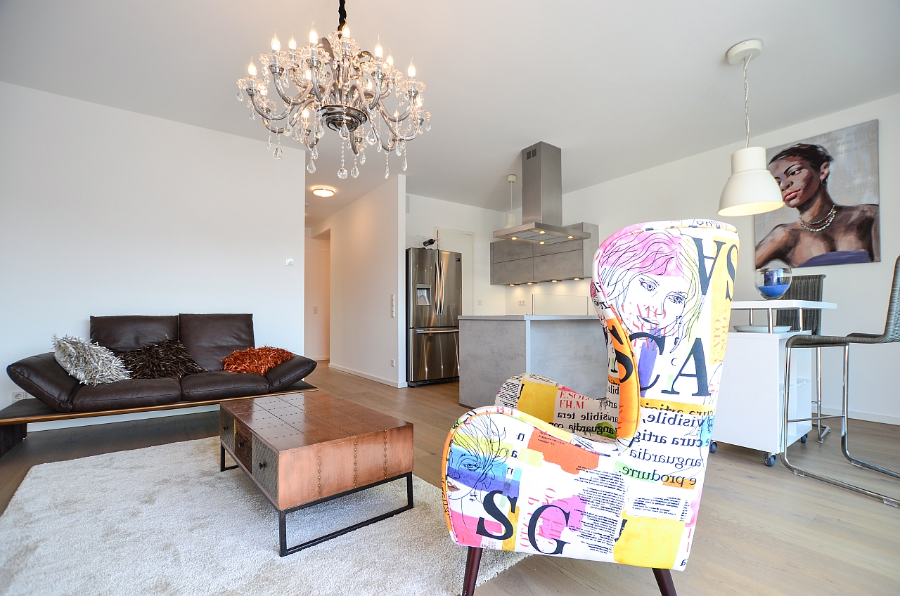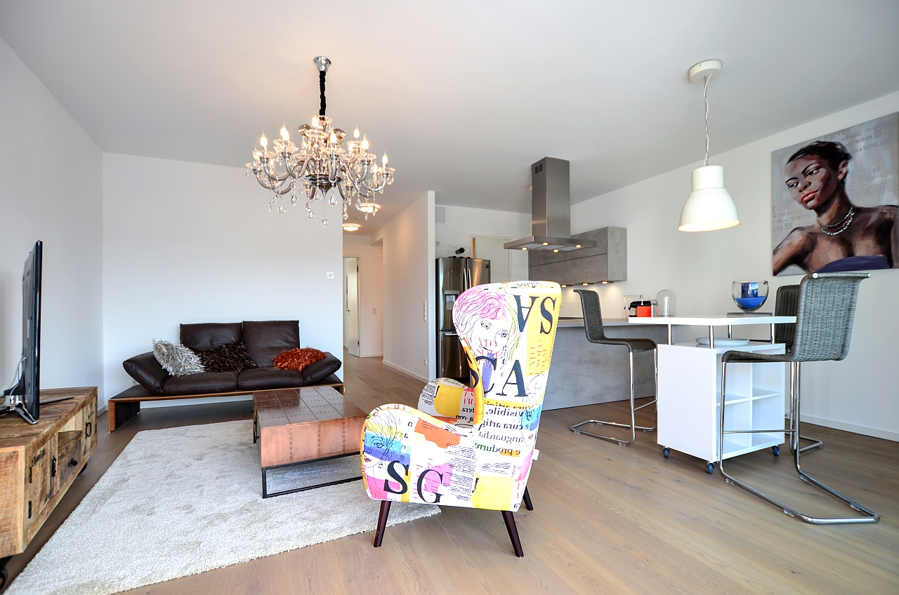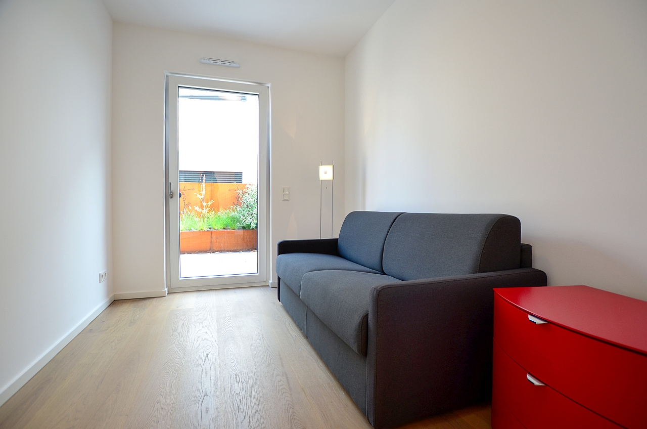 Large terrace, living room, bedroom with double bed 1.80 m, bed linen and towels available, pets not allowed, non-smoking, incl. biweekly cleaning and laundry service, underground parking on request against a fee, incl. wireless Internet access, max. 2 people, minimum term of lease 6 months, shorter rental period on request