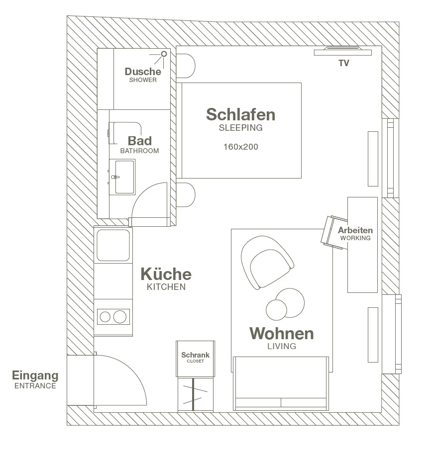 living room / bedroom with queen-sized bed 1.40 m, incl. Wifi internet access, Bed linen and towels not provided, cleaning service by arrangement against surcharge, pets not allowed, non-smoking, max. 2 people, 2nd person against surcharge, minimum term of lease 6 months