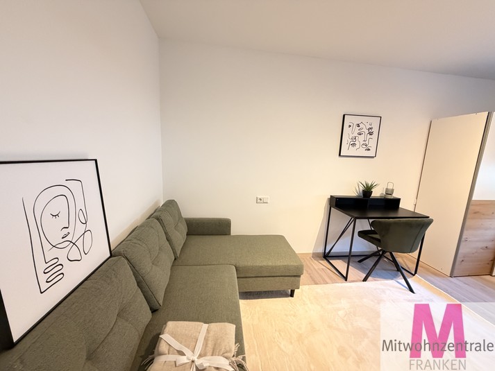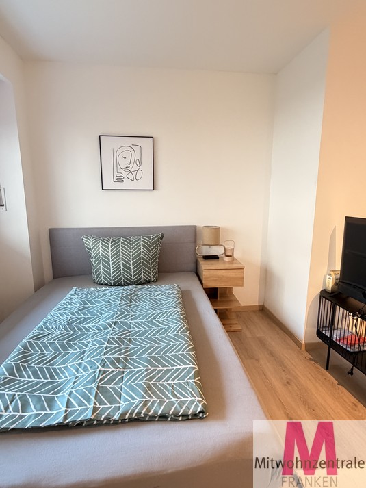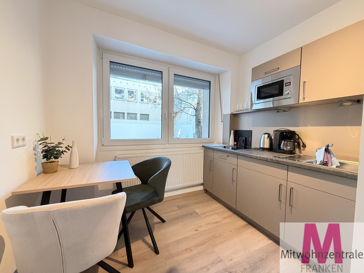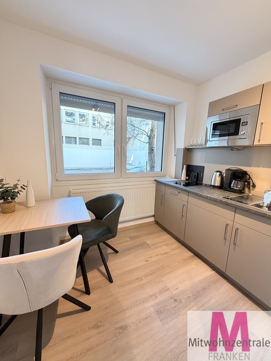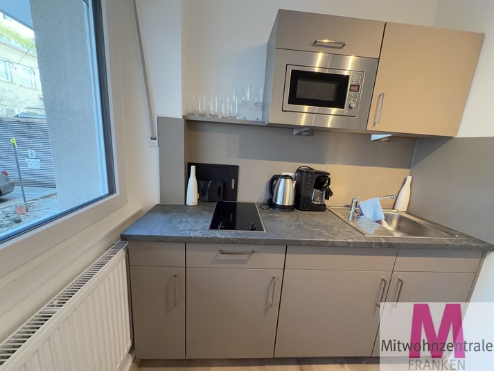 This completely renovated and modernly furnished 1-room flat is located in a central location in Nuremberg on the mezzanine floor of a well-maintained apartment building. It is fully equipped and impresses with its optimal floor plan. The bright living and sleeping area offers a high level of comfort and is furnished with a queen-size bed, wardrobe and sofa, among other things. The separate kitchen has modern fitted appliances and a dining area. The beige-tiled shower room is modernly equipped and has a washing machine.